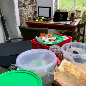 Hanging the images took the most part of a day, the next day a couple of hours was spent with ensuring additional pieces were in place and working. These included a repeating slide show of the images and a small tray lined with shredded paper of some of the beach finds starring in the images. I had considered running a looped film of me talking about the project and the work involved in making the images. Despite being in a large factory space I realised on preparatory visits that noises echoed and people were trying to work in the studios and offices in the same room and would not be happy with a repeating voice over. However, I was able to talk to visitors and also delivered several impromtu talks for school children and an Artist’s talk with a powerpoint slide show on the Saturday, borrowing a projector from The Clay Factory and using the inner door of the container as a screen.